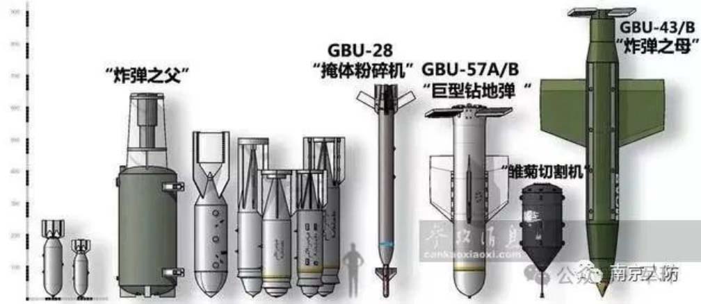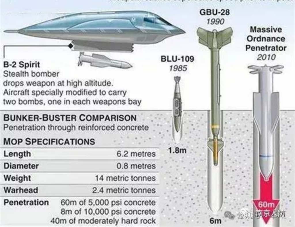 ▲MOP全重14噸,是美軍現(xiàn)役最重常規(guī)航彈,遠(yuǎn)超8.5噸級的GBU-43B“炸彈之母”(MOAB)燃料空氣炸彈,同時還是美軍現(xiàn)役武庫中鉆地能力最強(qiáng)的非核炸彈。